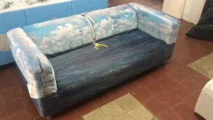Impresión y tapizado de las butacas con motivo cliente, moqueta a juego.