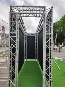 Estructura autoportante compuesta por dos truss, delantera y trasera, de 5000x3000mm, y con laterales de 1500x3000mm formando un cubo de 5000x3000x1500mm de fondo. Con contrapesos de hormigón en el interior de 1200kg.
