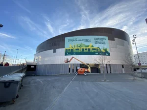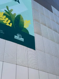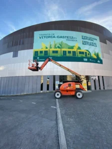 Gráfica atornillada a pared, con ojales y cable acerado tensado.